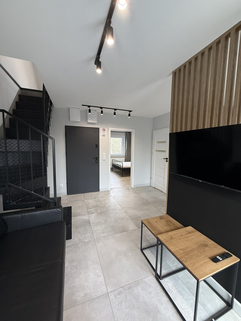 Modern and luxurious studio apartment, decorated in soft loft style with the area of 35m2. The guests have at their disposal a stylishly designed apartment equipped with a sofa bed for two people with a coffee table, a double bed, a very well equipped par
